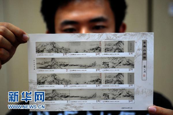 這是2010年《富春山居圖》成畫660周年之際首發(fā)的《富春山居圖》特種郵票。該郵票以《富春山居圖》整幅畫卷為藍(lán)本(5月11日攝)。當(dāng)日,元代黃公望《富春山居圖》(剩山圖)在浙江省博物館點(diǎn)交啟運(yùn),將經(jīng)由北京后赴臺(tái),于6月1日在“山水合壁——黃公望與《富春山居圖》特展”上,與臺(tái)北故宮博物院所藏《富春山居圖》(無用師卷)聯(lián)合展出。這將是該畫作兩部分在分別360年后首次實(shí)現(xiàn)合璧。新華社記者 韓傳號(hào) 攝
