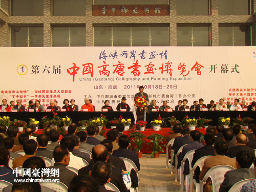 中國臺灣網(wǎng)10月25日聊城消息 10月18日至24日,第六屆中國(高唐)書畫博覽會暨海峽兩岸書畫作品大型聯(lián)展活動在山東省聊城市高唐縣成功舉辦。山東省人大常委會原副主任董鳳基、省文化廳巡視員邢玉斗、省委臺辦副巡視員莊衛(wèi)平、省文聯(lián)副主席楊楓、聊城市委副書記劉加順等領(lǐng)導(dǎo)出席開幕式,海峽兩岸經(jīng)濟文化交流協(xié)會會長徐東萌及臺灣著名畫家李奇茂等兩岸書畫界名家應(yīng)邀參加。
