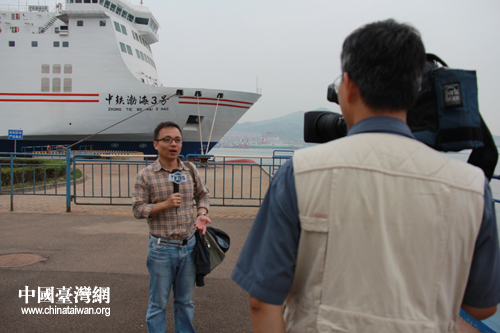臺灣記者采訪煙大鐵路輪渡。(煙臺臺辦 王國勝 攝)