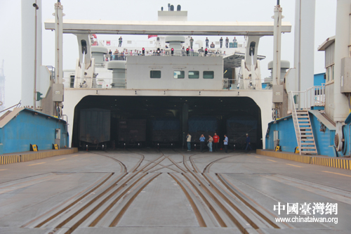 渡船的第三層,旅客們沿著下船通道梯有序的下船;渡船的第二層,近百輛裝滿各種貨物的大卡車,一輛接著一輛的駛出船艙;渡船的第一層,寬敞的船艙并排擺放著五列火車車廂。內(nèi)燃機車頭沿著路路軌道緩慢的駛過路船連接處進入了船艙,掛接好車廂,將50節(jié)車廂一次次的拖出船艙……壯觀的場面又一次讓臺灣記者們驚嘆。