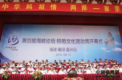 中國臺(tái)灣網(wǎng)6月15日莆田消息 以“中華馬祖情、兩岸一家親”為主題的第四屆海峽論壇·媽祖文化活動(dòng)周于今日上午在湄洲島天后廣場舉行開幕式。本屆媽祖文化活動(dòng)周以全國臺(tái)聯(lián)為指導(dǎo)單位,由莆田市人民政府、福建省臺(tái)辦、福建省臺(tái)聯(lián)共同主辦。莆田市政協(xié)主席林慶生主持了開幕式,莆田市長梁建勇致歡迎詞,中華媽祖文化交流協(xié)會(huì)副會(huì)長兼秘書長、湄洲媽祖祖廟董事長林金榜及臺(tái)灣媽祖宮廟代表蔡詠锝致辭。在開幕式上,全國臺(tái)聯(lián)主席梁國揚(yáng)等四位嘉賓共同啟動(dòng)“第四屆海峽論壇·媽祖文化活動(dòng)周”開幕按鈕。