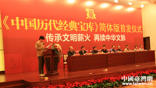 中國(guó)臺(tái)灣網(wǎng)5月9日北京消息 今天下午,由海峽兩岸出版界攜手編輯出版的《中國(guó)歷代經(jīng)典寶庫(kù)》簡(jiǎn)體版首發(fā)式在北京舉行。國(guó)務(wù)院臺(tái)灣事務(wù)辦公室宣傳局處長(zhǎng)尚君奇、中國(guó)友誼出版公司總經(jīng)理史寶明、著名作家梁曉聲、著名演員王剛等海峽兩岸出版界代表、文化界人士出席了首發(fā)式。