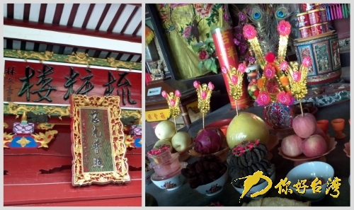 梳妝樓里的供品讓人印象深刻。幾個紅色的塑料盤里托著各式各樣的化妝品,種類繁多,有護膚品、有粉餅,還有頭飾。媽祖像前長期放置的一排供品也很有特色,香菇、餅、豆干等各種素食整齊地疊放,呈上小下大的寶塔狀,每個寶塔的頂端都插上一朵小紅花。或許,媽祖生前也愛紅花吧?