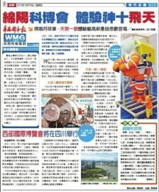 《華西都市報·臺北版》每周一期,內容由華西都市報采訪編輯,旺報承擔具體版面并出版發行。報道內容涉及經濟、民生、文化、旅游等,既反映臺灣同胞在四川的投資發展、學習生活狀況,也及時向臺灣讀者報道四川的城市、經濟、社會發展。今日在臺灣《旺報》推出的首期《華西都市報·臺北版》,隆重地報道了剛剛在綿陽舉行的科博會盛況,讓臺灣讀者充分體會到中國科技城綿陽的獨特魅力。
