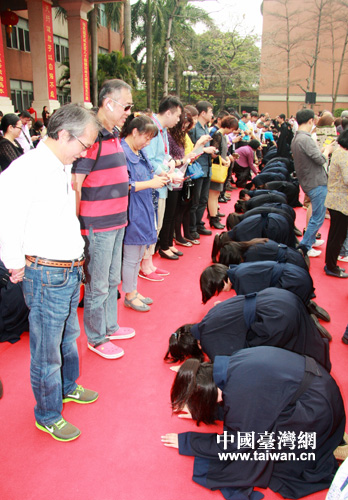 參加成年禮學(xué)生向父母行叩拜禮,感謝父母養(yǎng)育之恩。 (中國(guó)臺(tái)灣網(wǎng)發(fā) 王羽威攝)