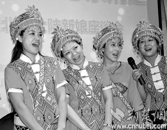 圖為:湖北籍大陸新娘座談會上,來自恩施州的姑娘們一起唱起土家族民歌“六口茶”。