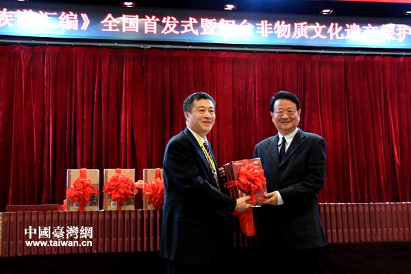 《臺海文獻匯刊》、《閩南涉臺族譜匯編》29日在京首發,圖為全國臺聯會長汪毅夫接受閩南師范大學贈書(中國臺灣網 李徽 攝)
