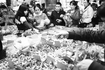 澳門:人們?cè)诎拈T義字街的年貨市場(chǎng)購買食品(2月9日攝)。新華社記者 張金加攝