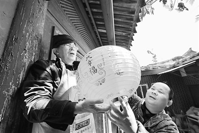 福建:在福建泉州,陳建國(右)和鄰居一起在“老范志”大厝里掛上新燈籠,迎接新年到來(2月13日攝)。新華社記者 魏培全攝