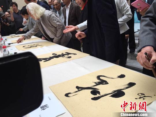 圖為來自兩岸的五位書法家現場書寫“兩岸翰墨情”。 施佳秀 攝