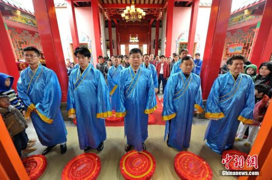 資料圖:2014年12月13日,孔子第78代孫、臺灣孔子協會理事長、臺灣孔子學院院長孔維勤攜臺灣儒家文化代表團,海南孔子后人在擁有606年歷史的?谑忻佬麓蹇讖R進行祭拜儀式。中新社發 駱云飛 攝