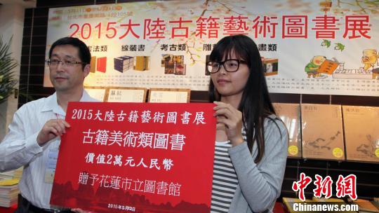 5月12日,2015大陸古籍藝術類圖書展大陸代表團團長崔曉軍(左)向花蓮市立圖書館贈送了天津楊柳青畫社在內多家出版社《中國畫技法》等一批古籍美術類圖書。 劉舒凌 攝