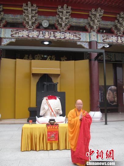 來自河北幽居寺的北齊時期釋迦牟尼像佛身21日下午在佛光山大雄寶殿前開箱,佛光山住持心保和尚帶領佛光山僧眾舉行了莊嚴的迎請儀式。 應妮 攝
