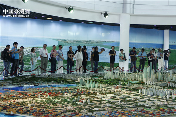 臺灣中南部媒體訪問團采訪天津濱海新區,圖為天津濱海新區規劃展覽館內合影。(中國臺灣網 段雯婷 攝)