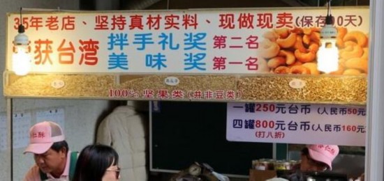 日月潭水社碼頭旁的杏仁酥攤設身處地為陸客著想,將攤位改成簡體字、售價也用人民幣標示清楚,反而在這一波陸客減少潮中未受沖擊。(圖片來源:中評社)