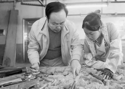 鄭銀聘(左)在傳授徒弟雕刻技藝。 本報(bào)記者 劉深魁攝