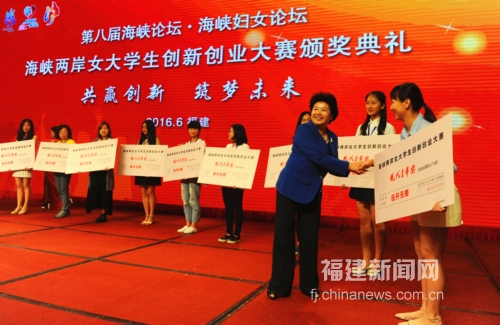 “筑巢”還需“引鳳”來。為進一步激發兩岸女大學生創業活力,福建省婦聯與福建省教育廳聯合發起首屆海峽兩岸女大學生創新創業大賽。經過近半年的角逐,決出一批優秀創業項目。出席本屆論壇活動的全國婦聯副主席孟曉駟、國臺辦副主任龍明彪、福建省人大常委會副主任陳樺、福建省婦聯主席吳洪芹等領導為兩岸獲獎女大學生頒獎。