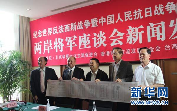 座談會(huì)現(xiàn)場(chǎng),兩岸的老將軍共話抗戰(zhàn)歷史,撫今追昔,表達(dá)了共同的心聲:中國(guó)人民抗日戰(zhàn)爭(zhēng)是世界反法西斯戰(zhàn)爭(zhēng)的重要組成部分,中國(guó)戰(zhàn)場(chǎng)是世界反法西斯戰(zhàn)爭(zhēng)的東方主戰(zhàn)場(chǎng)。70年前國(guó)共合作共御外侮,才最終取得中華民族英勇抗戰(zhàn)的偉大勝利,為世界反法西斯戰(zhàn)爭(zhēng)的勝利做出了巨大貢獻(xiàn)。在當(dāng)今復(fù)雜的國(guó)際形勢(shì)下,兩岸同胞更以民族大義為重,團(tuán)結(jié)一致、攜手奮斗,為實(shí)現(xiàn)祖國(guó)統(tǒng)一和強(qiáng)盛、共圓民族復(fù)興夢(mèng)做出歷史性貢獻(xiàn)。