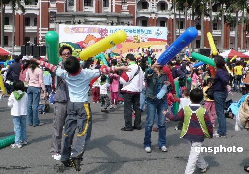 三月八日,連日陰雨的臺北市天空放晴,近千名小朋友和家長一起在臺北市一廣場參加親子運動會,享受陽光和玩耍的樂趣。中新社發 路梅 攝
