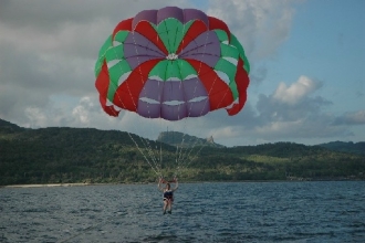 臺(tái)灣民眾喜愛(ài)旅行東南亞島嶼,這些海島度假區(qū)大多擁有漂亮的沙灘,湛藍(lán)的海水和迷人的艷陽(yáng)藍(lán)天,墾丁三者兼具,也是很適合親水的海濱度假勝地。海外海島常見(jiàn)的海上拖曵傘活動(dòng),在墾丁也有機(jī)會(huì)體驗(yàn),而且是難度較高的海上船舶起降。游客隨著拖曵傘緩緩升到空中,墾丁山海和聚落景觀盡收眼底。