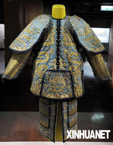 這是10月6日在臺北拍攝的雍正皇帝御用鎧甲“月白緞繡金龍銅釘棉甲”新華社發(吳景騰 攝)