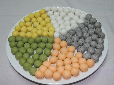 五行客家湯圓的顏色來自于自然食材的原色,不加人工色素,采用紅蘿卜、菠菜、南瓜、芝麻及米團本來的白色,所以一道料理可以吃到五種口味的湯圓,其中芝麻最香。老板娘又表示,客家湯圓要好吃,就要依照古老的方法,由洗米、泡米、磨漿、濾去水份,再揉成一粒一粒的湯圓,這樣的湯圓才會比較Q,而不是用米粉直接和水制作的湯圓所能比。同時要有五種顏色,再制作過程更加費時,而且以手工完成,每天能供應的數量有限。