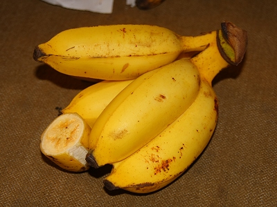目前有一種顏色呈黃色,類似芭蕉的三合蕉,整個(gè)攤位只看到一牌手寫的瓦楞紙,一面寫三合蕉三個(gè)字,另一面寫著芭蕉、臺(tái)中蕉、日本土蕉,也就是由這三種蕉經(jīng)過約4年的改良研究,所呈現(xiàn)的一種新品種,盛產(chǎn)期在3月至9月,慢者可以到1月或2月,所以現(xiàn)在的長度,只有盛產(chǎn)時(shí)的2/3左右,它有芭蕉的酸味、日本土蕉的甘、臺(tái)中蕉的甜,吃起來有酸甘甜的口味,外形還滿可愛的,最大的不同點(diǎn),是橫切開時(shí),可以看到類似蜜蘋果的情形。而7月到9月可以看到紅皮的蘋果香蕉。要品嘗奇特的水果,可以試試看。