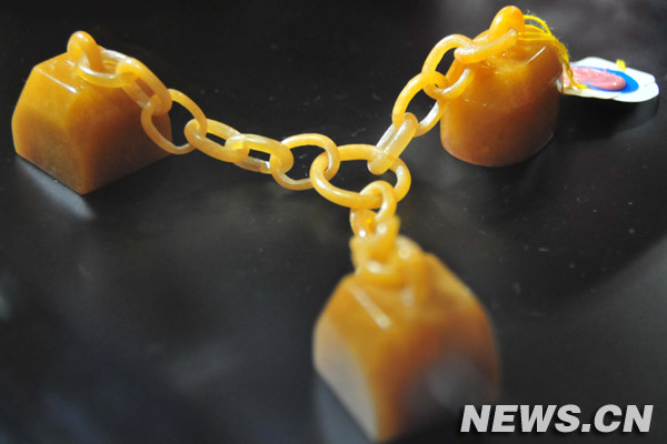 三連扣田黃印壹組三枚。新華社駐臺(tái)記者 徐 然 攝