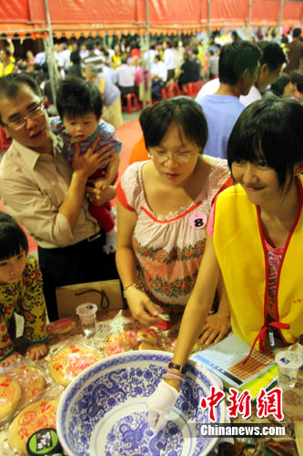 9月8日,由兩岸廈門、漳州、金門、臺灣本島共同舉辦的“2010中秋博餅狀元王中王大賽”臺灣地區比賽在高雄關帝廟開場,超過500民眾參賽爭“狀元”。中新社記者 劉舒凌 攝