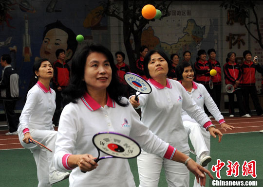 12月4日,海峽兩岸柔力球、健身氣功交流活動(dòng)在福州群眾路小學(xué)舉行。圖為參加該交流活動(dòng)的86名臺(tái)灣柔力球愛好者做精彩表演。中新社記者 劉可耕 攝