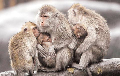 許多動物也得強忍低溫。高雄壽山動物園的獅王與同伴蜷縮相依、失去威風,紅毛猩猩裹著軍毯趴趴走,園方還為樹獺、綠鬣蜥加裝保溫燈、防風帆布。臺北市立動物園的猴子則瑟縮依偎、把小猴緊抱懷中取暖。
