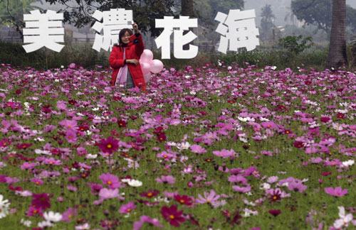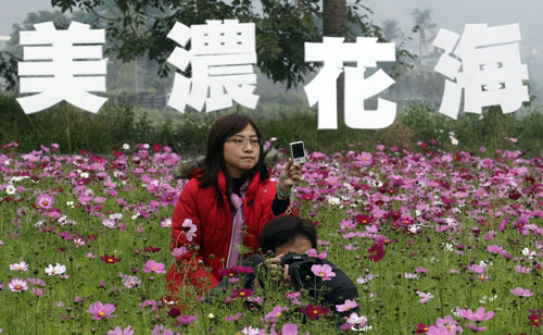 高雄美濃“2011花之樂章”30日舉行開園日,民眾仿佛置身浪漫風情,自拍花海美景。 圖片來源:“中央社”