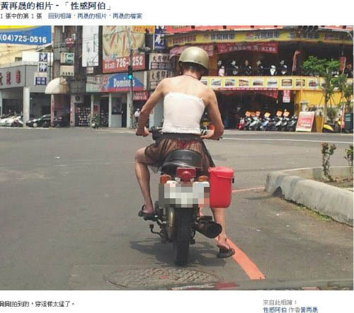拍到“性感阿伯”的是臉書用戶“黃再晟”。他23日在馬路上發現“性感阿伯”,立刻拍下來上傳到臉書(Facebook),直呼“剛剛拍到的,穿這樣太猛了。”“真人真事親眼目睹,當下震驚萬分!”據其它網友指出,拍照地點在彰化市中山路2段。