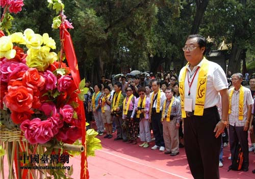 臺灣文化大學(xué)教授周談輝向黃帝陵敬獻花籃(陜西省臺辦 張群莉 攝)