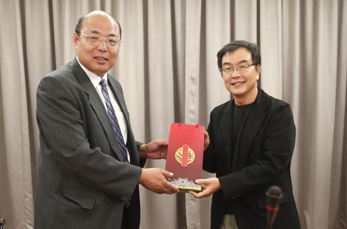 臺灣聯(lián)合晚報社長項國寧(右)與參訪團團長、中國臺灣網(wǎng)副總編輯吳彤互贈禮物。(中國臺灣網(wǎng) 陳佳慧 攝)