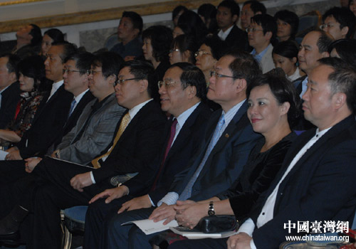 中共上海市委常委楊曉渡(前排右四)、中國國民黨大陸事務部主任高輝(前排右三)、上海市臺辦主任李文輝(前排右五)、上海市臺協(xié)會長李茂盛等和臺商們一起觀看演出。(圖片來源:上海市臺辦)