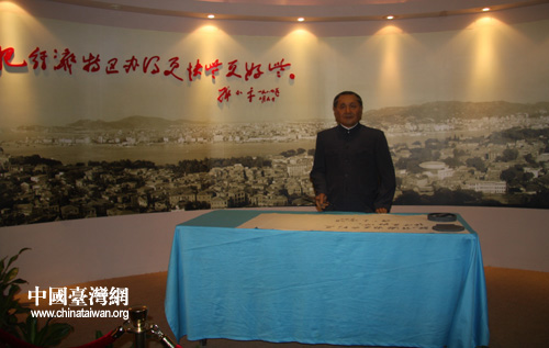 在鄧小平同志視察廈門陳列室里,鄧小平題字的塑像吸引了眾多記者的目光。這個立體呈現(xiàn)的場景,重現(xiàn)了小平同志1984年視察湖里并題詞時,現(xiàn)場使用過的桌子、臺布、沙發(fā)及窗簾布等。塑像背后,正是當(dāng)年小平同志的題詞:“把經(jīng)濟特區(qū)辦是更快些更好些。”(中國臺灣網(wǎng) 趙靜 攝)