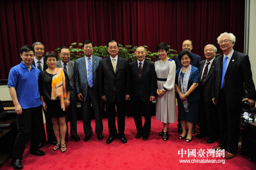 參訪團團長武韜(左五)、中央電視臺陳鐸(右一)、書法大師王成喜(右二)、于丹教授(右五)及京劇大師梅葆玖(右六)等一行拜會中國國民黨榮譽主席連戰(左六)。(圖片來源:中國臺灣網)