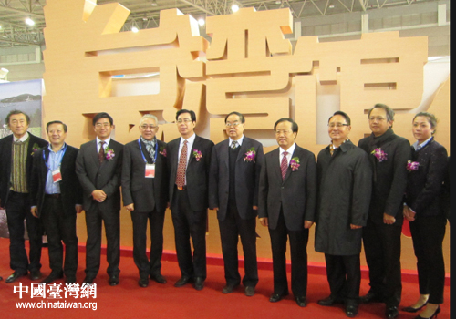 威海市領導和臺灣嘉賓在威海文博會臺灣館前合影(威海市臺辦 孫姍姍 攝)