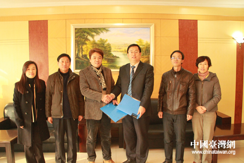臺灣華幼網數碼科技有限公司負責人與濰坊科技學院副院長王建平、壽光臺辦主任韓興武等合影。(圖片來源:濰坊臺辦)
