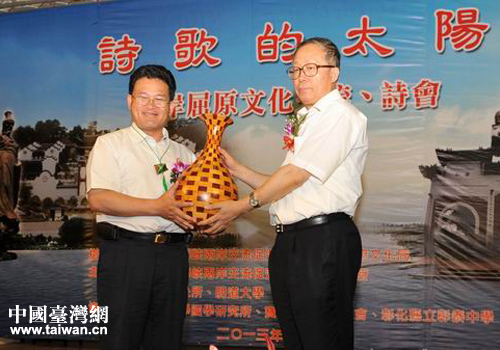 5月30日,李鴻忠在彰化市彰泰中學出席《詩歌的太陽》詩會,會見彰化市長邱建富先生,互贈禮品。(圖片來源:湖北省臺辦)