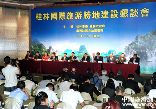 中國臺灣網(wǎng)8月9日臺北消息 8月8日,桂林國際旅游勝地建設(shè)懇談會(huì)在臺北舉行。臺灣“三三會(huì)”會(huì)長江丙坤、臺灣海峽兩岸觀光旅游協(xié)會(huì)會(huì)長謝謂君、臺灣旅游商業(yè)同業(yè)總會(huì)理事長姚大光、臺灣工業(yè)總會(huì)秘書長蔡練生出席并致辭,桂林市委書記趙樂秦作了國際旅游勝地建設(shè)新聞發(fā)布。