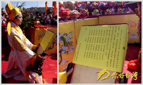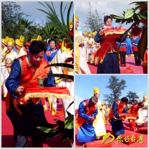 14點(diǎn)18分,象征財(cái)如水漲的海水開始漲潮,青浦底海灘上擂鼓三通,海螺長(zhǎng)鳴,禮炮九響恭請(qǐng)媽祖金身安座,海祭儀式正式開始。湄洲媽祖祖廟董事會(huì)董事長(zhǎng)林金榜等三位主祭人率兩岸信眾,面朝大海,向媽祖神像行三跪九叩大禮。