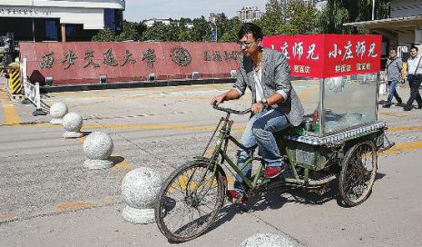 西安交通大學南門對面的金水路路口,一個名為“小莊師兄”的涼皮攤位吸引了市民張先生的注意。這個只有一輛生銹的三輪車、一張案板、一把遮陽傘、一張桌子、4個凳子的攤位,卻擁有一名“英語口語很棒”的老板。