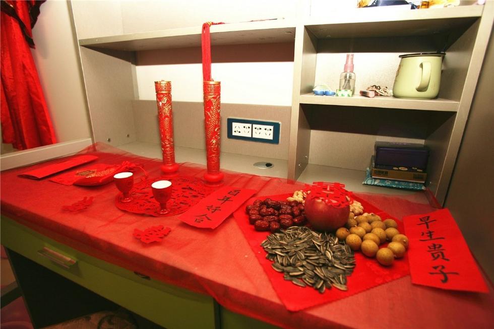 昨天“光棍節”,天津南開大學津南校區的幾名女生別出心裁,將“閨房”布置成“婚房”,打造起了“結婚”主題宿舍。