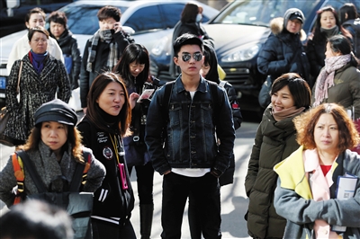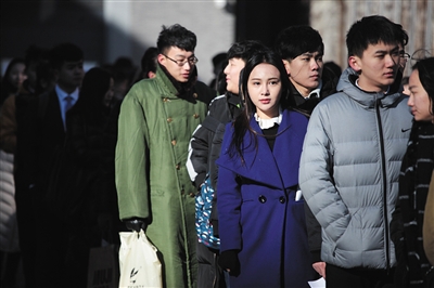 15日,中央戲劇學院,寒風中考生在排隊等待進入考場。