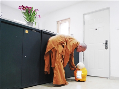 從誕生之日起,賢二機(jī)器僧就經(jīng)常“四處云游”。記者了解到,從出生至今,賢二先后在廣州國(guó)際動(dòng)漫節(jié)、廈門國(guó)際佛事展、北京國(guó)家會(huì)議中心舉行的機(jī)器人大會(huì)上亮相,這些活動(dòng)都由寺里的居士或者義工帶著賢二前往。在記者見到賢二的當(dāng)天,它剛被送回到龍泉寺里。