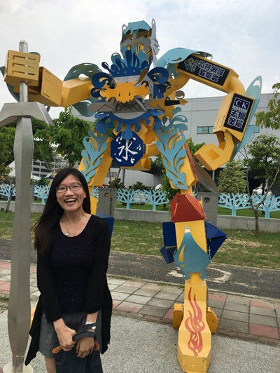 臺北游客陳小姐到臺灣金屬創意館參觀,看到變形金剛候車亭直呼好酷,并要找朋友一起來臺南搭公交車。