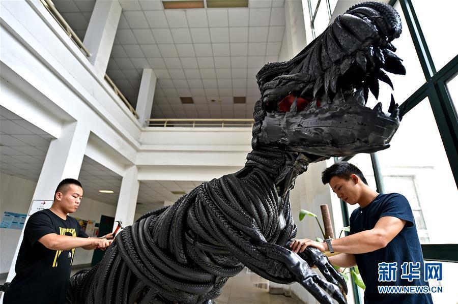 5月28日,河南洛陽師范學院大學生在對“輪胎恐龍”進行修整。河南洛陽師范學院5名大學生利用回收的約600個廢棄自行車輪胎,耗時一個半月制作完成了一只高2.3米、長4米的恐龍模型。據團隊成員劉子禪介紹,這只“輪胎恐龍”先用螺紋鋼焊接出骨架,之后根據恐龍關節及肌肉的實際需要,將自行車車胎裁剪、扯平,包裹整個骨架。新華社發 黃政偉 攝 圖片來源:新華網