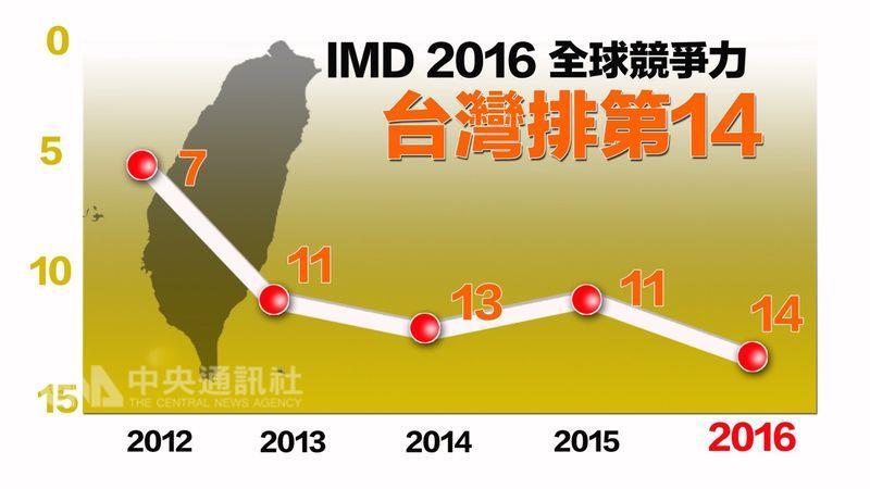 根據IMD公布全球競爭力評比資料顯示,臺灣在2011年表現最佳,競爭力排名躍升至全球第6名,是史上最好成績;2012年臺灣競爭力排名退步到第7名,2013年排名11,2014年排名13,2015年臺灣競爭力評比排名第11,今年則退步3名,跌落至第14名。